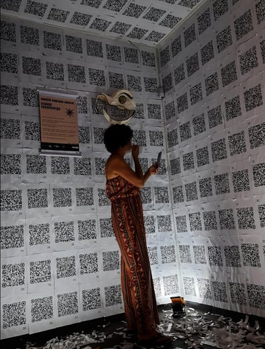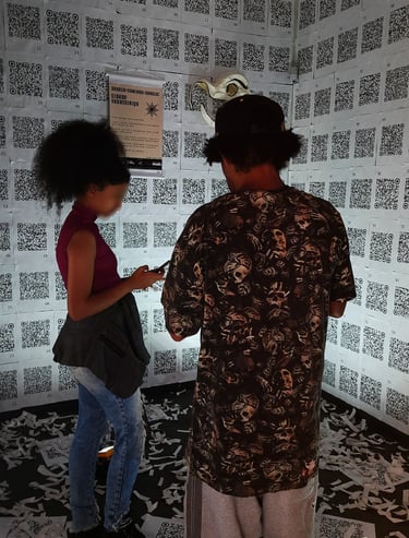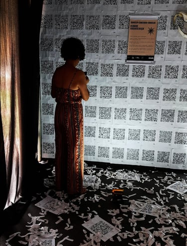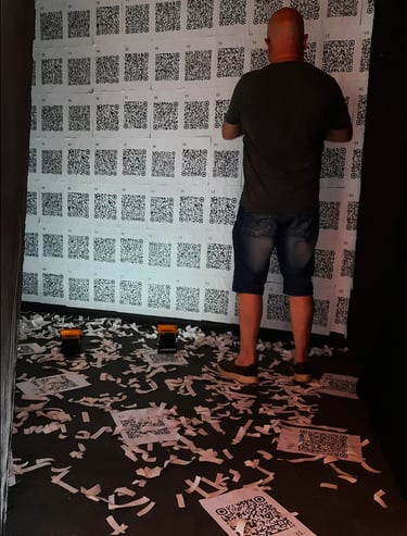 O primeiro ambiente foi coberto (paredes e teto) por QR Codes que conectavam o público presente às curtas animações em .gif através dos diversos hiperlinks. A proposta teve como foco criar um espaço de experimentação do espaço percorrido unicamente pelas animações, relacionando-se com as obras visuais fora, e ao mesmo tempo dentro, do espaço virtual no qual a cartografia completa se encontra hospedada.